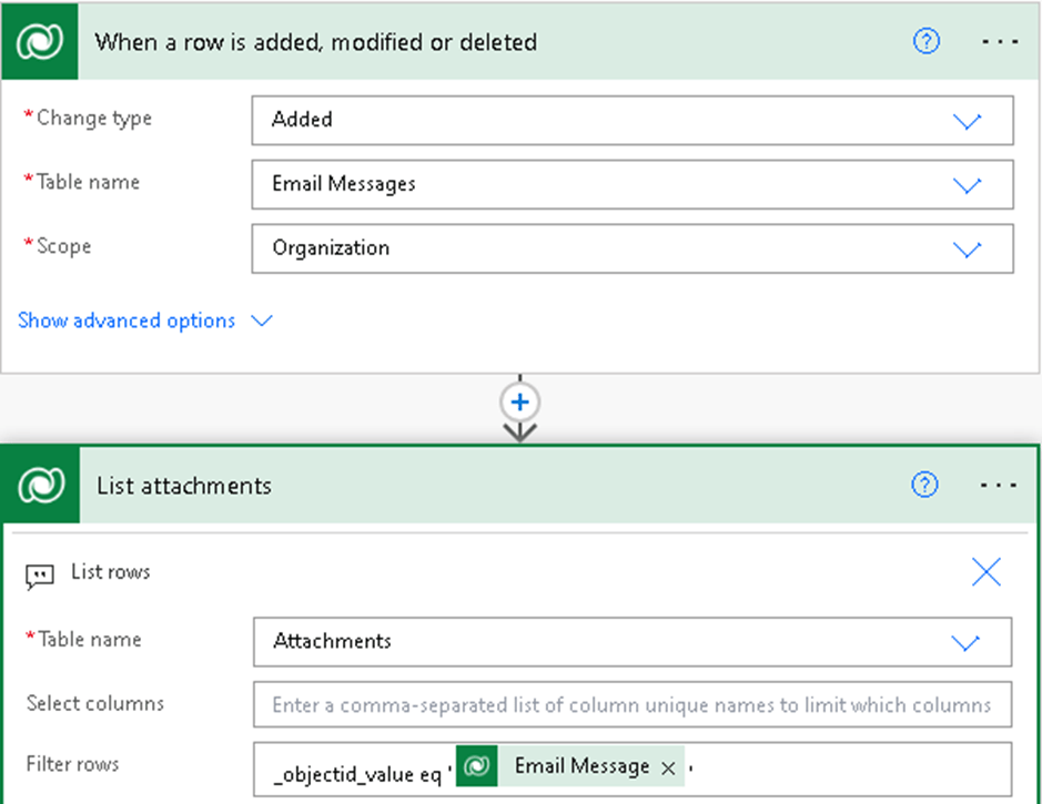 When an email is stored in the “Email Messages” table, the attachments are not stored within the same table. You must perform a lookup in the “Attachments” table and then use the “Filter rows” action with the value “_objectid_value eq ‘Email Message,’” which is a unique identifier for the email activity.